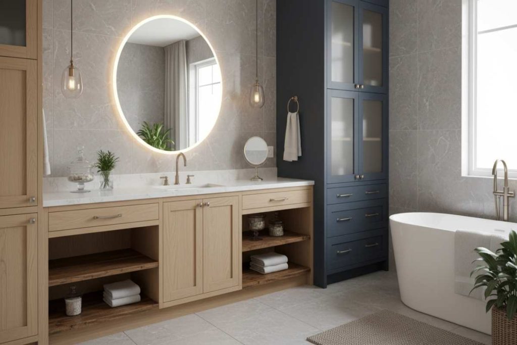Our bathroom cabinets are designed to bring both elegance and practicality to your space, offering customized solutions that meet your specific needs and design preferences. Whether you’re renovating a small powder room or a spacious master bath, our cabinets are built to enhance your bathroom’s functionality while adding a touch of luxury. We understand that bathrooms are not just places of function but personal sanctuaries, and that’s why our cabinets are crafted to provide both beauty and durability.We offer a variety of custom bathroom cabinetry styles, including modern, traditional, and transitional designs, ensuring there’s a perfect fit for your taste.Our cabinets are available in a range of materials, from classic woods to high-end engineered surfaces, each chosen for its aesthetic appeal and long-lasting durability.