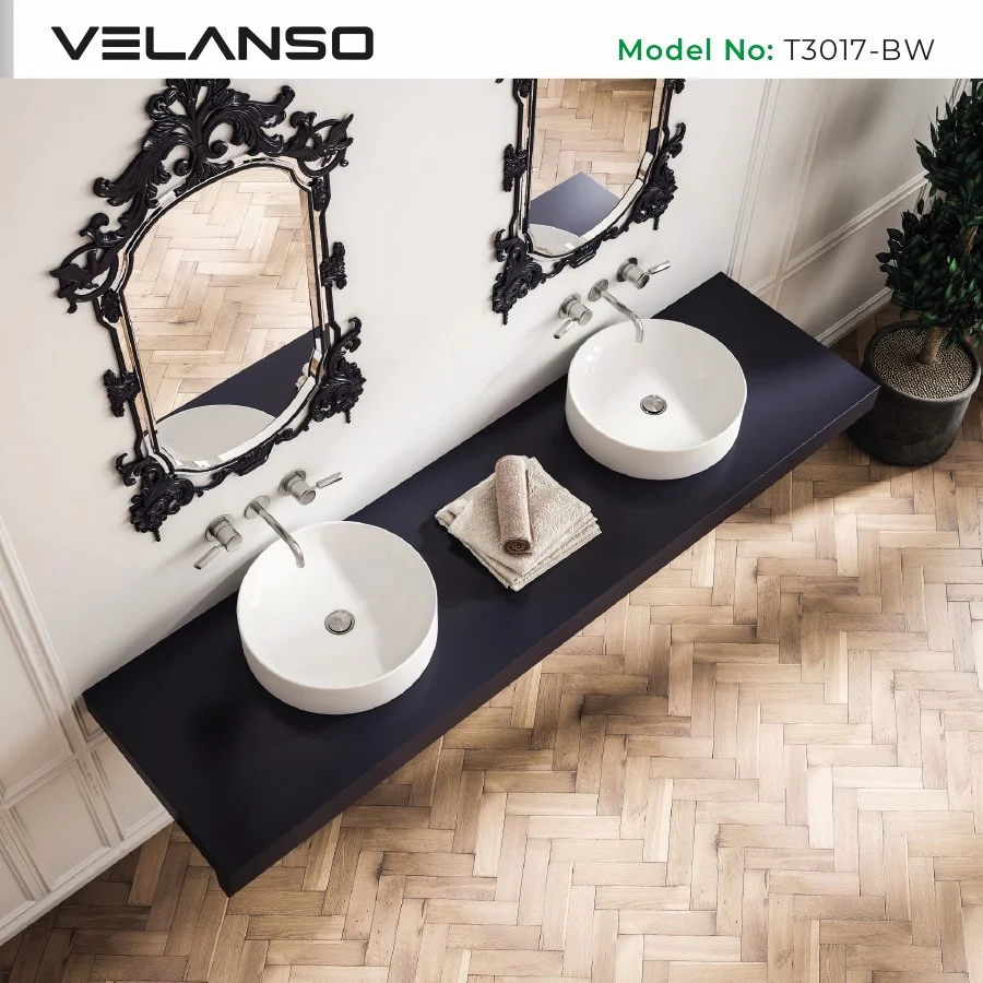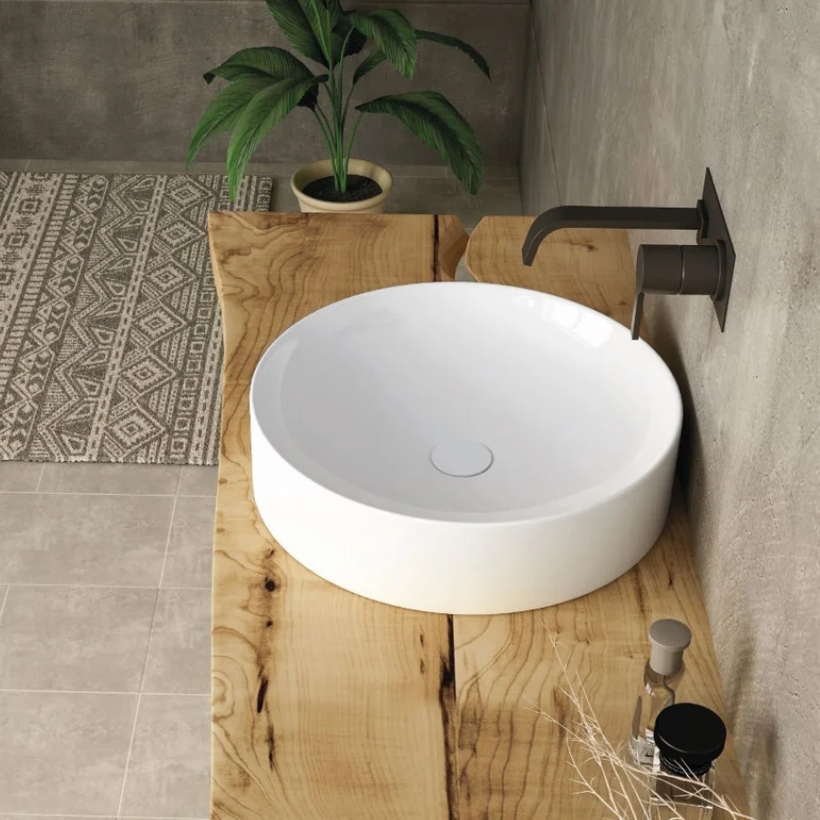 - Upright vessel (above-counter) installation for a strong focal point in bathroom design.